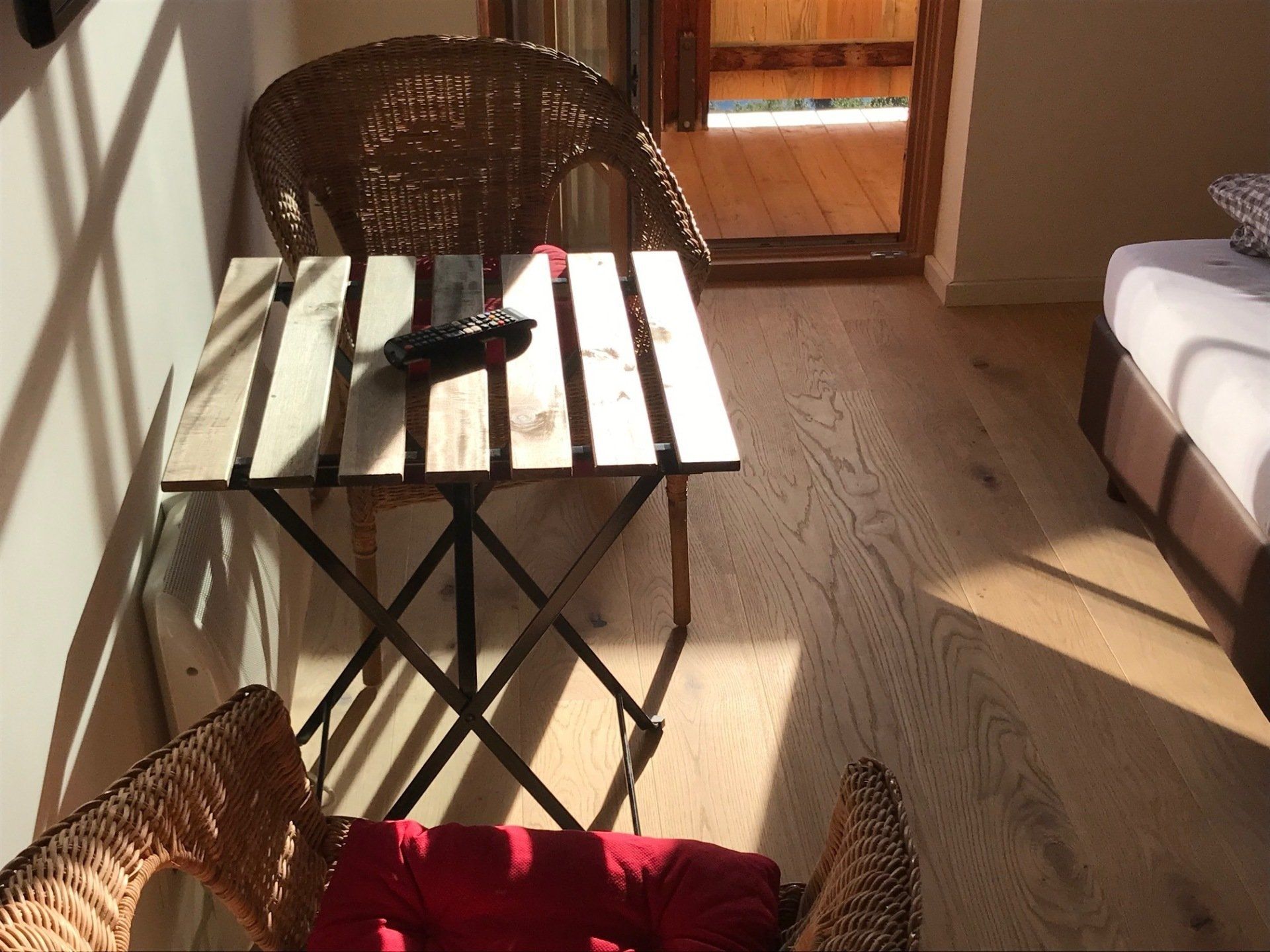 traumhafter Talblick, ruhig, Gartenmöbel am Balkon.